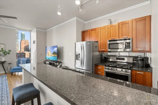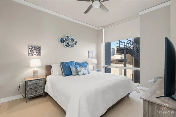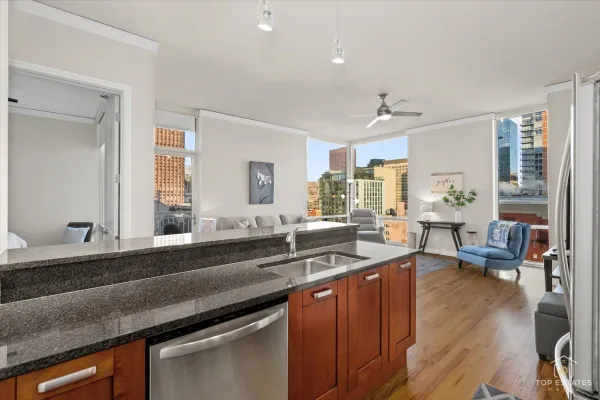 Gorgeous 2 bedroom/ 2 bath condo in Printer's Row! Unit is flooded with natural light throughout! Corner unit with incredible city views.!10 ft. ceilings, hardwood flooring in living room plus beautiful crown molding and finishes. Sleek kitchen with plenty of cabinets and breakfast bar seating. Master suite with large closets and en suite bathroom with whirlpool tub. Split bedroom plan is great for guests! Located in thriving Printer's Row! Walk to restaurants, shopping and the riverwalk. One 2nd floor deeded parking spot included ! Great in town unit in perfect condition!First showings Saturday January 31st from 11-1!